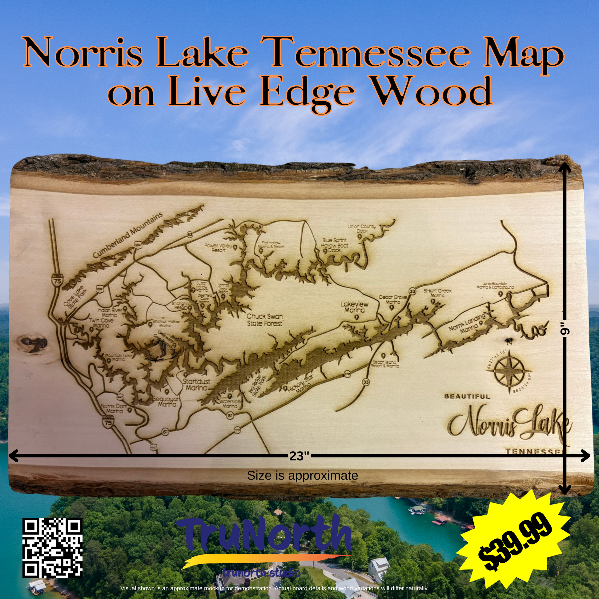 Handcrafted Norris Lake Tennessee Map on Live Edge Wood